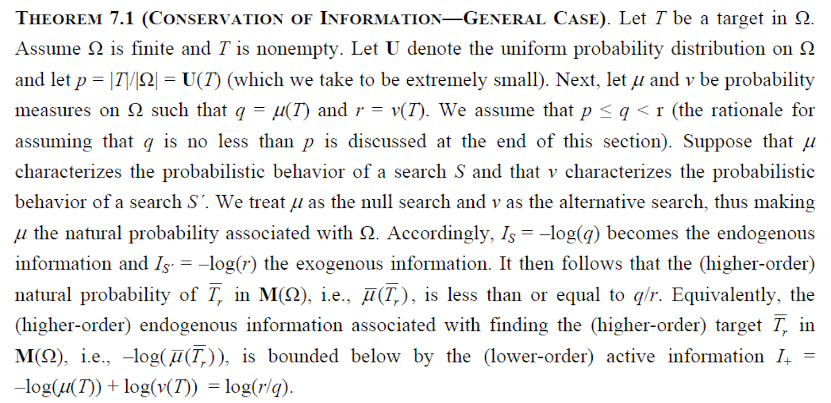 Even though the statement of this theorem is notation-heavy and will appear opaque to most readers, I give it nonetheless because, as unreadable as it may seem, it exhibits certain features that can be widely appreciated, thereby helping to wrap up this discussion of conservation of information, especially as it relates to Rosenhouse’s critique of the concept. Consider therefore the following three points:
