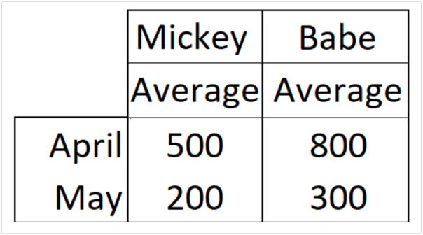 Baseball player Babe had a batting average of 800 in April and 300 in May. Mickey’s batting average was lower in both months, namely 500 in April and 200 in May. These results are summarized in the table: